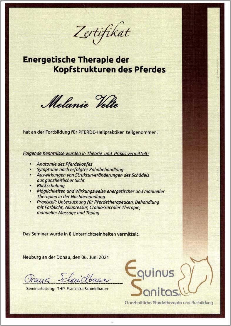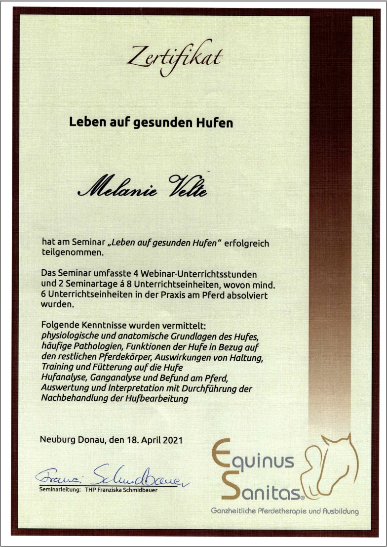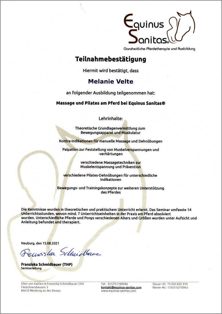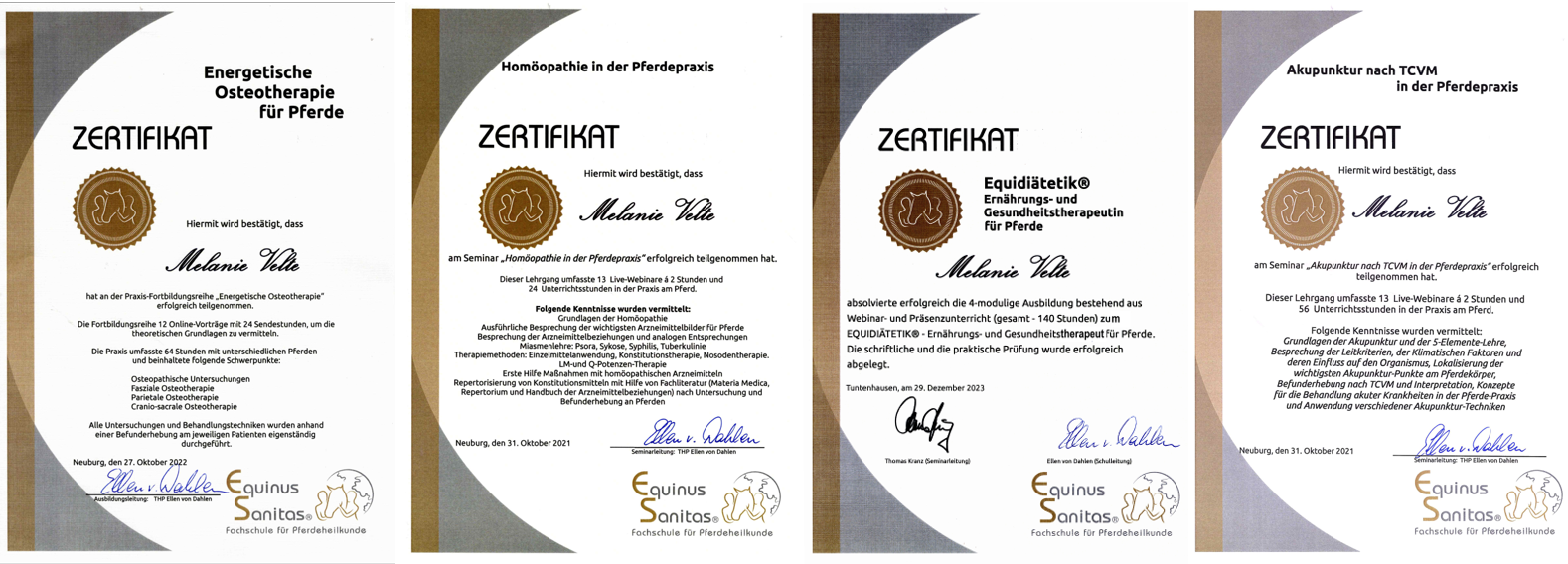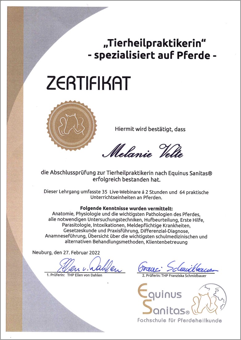 Zertifikat Tierheilpraktikerin spezialisiert auf Pferde