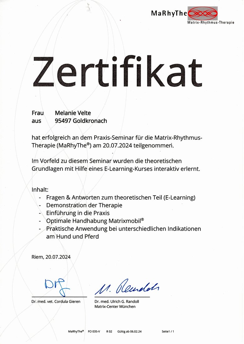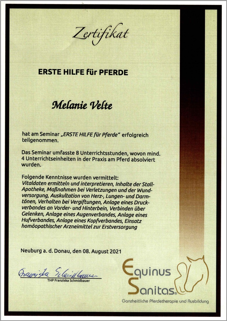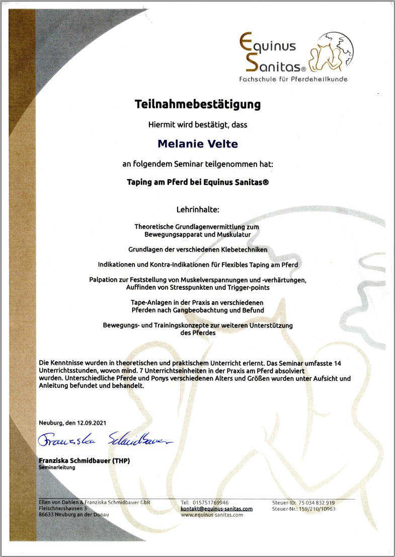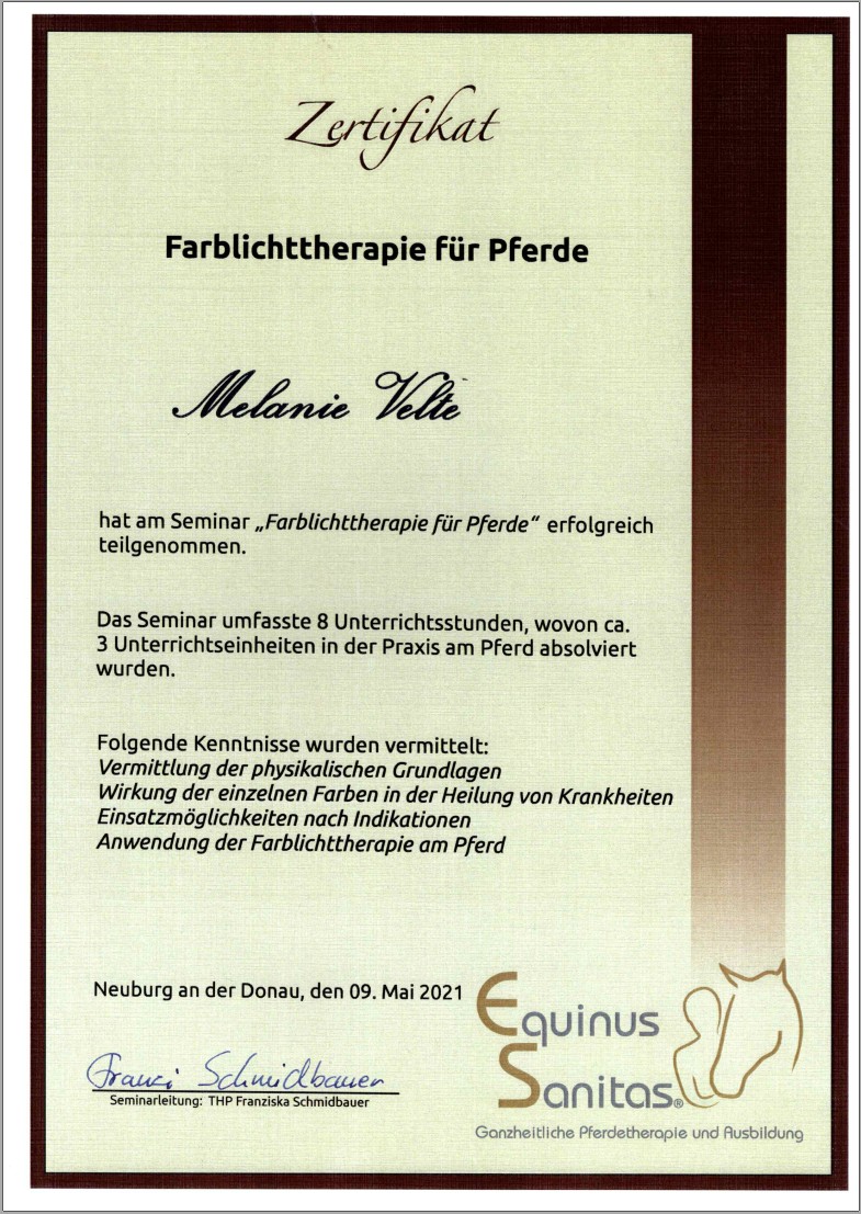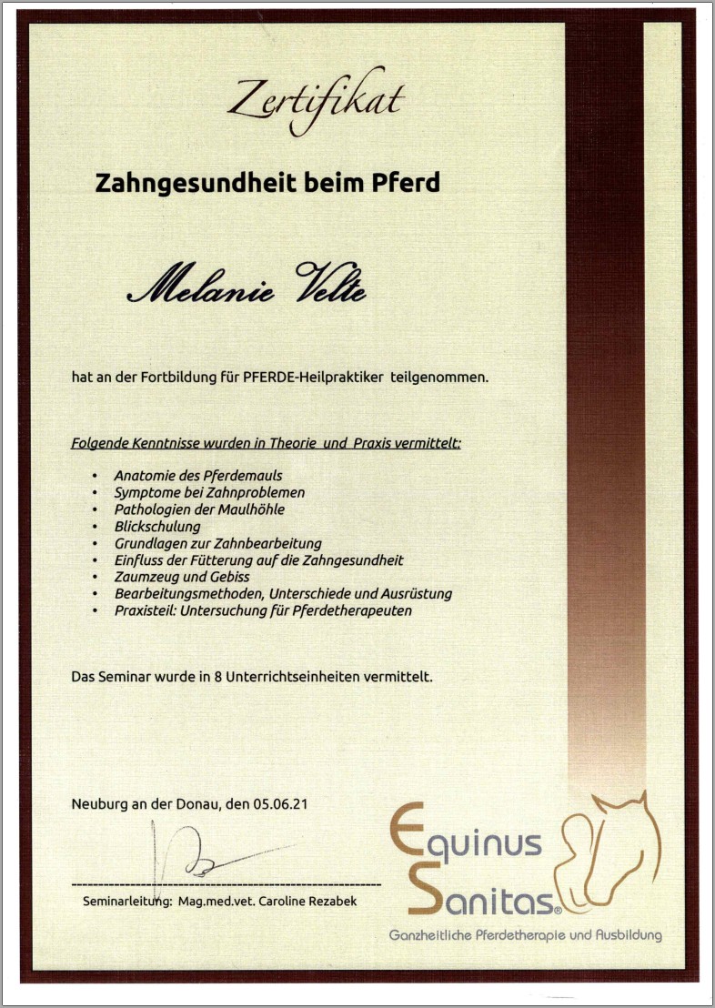 Zertifikat Tierheilpraktikerin spezialisiert auf Pferde